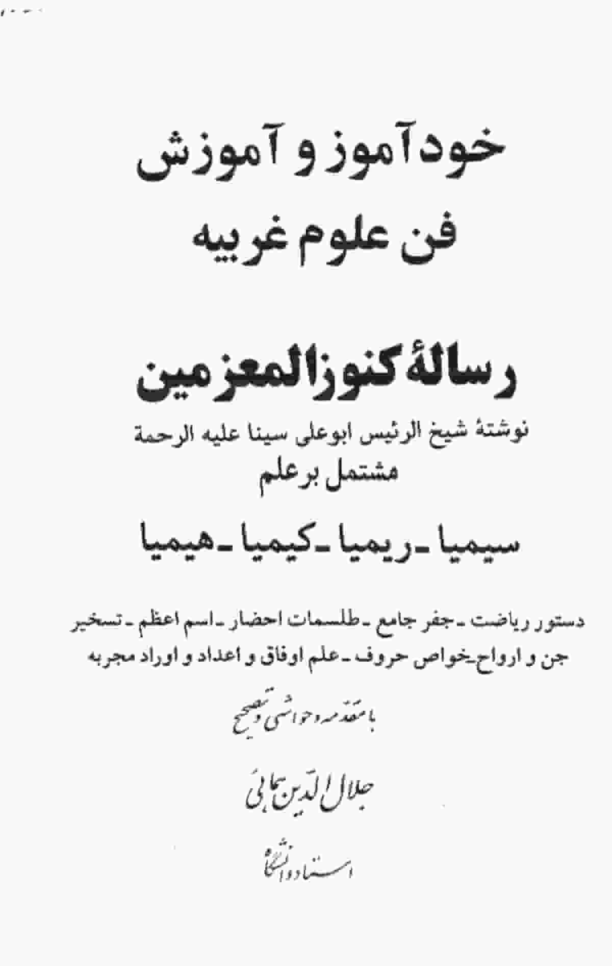 این کتاب در آموزش علوم غریبه یا همان رساله کنوزالمعزمین اثر شیخ الرئیس ابوعلی سینا با مقدمه و تصحیح جلال الدین همایی مشتمل بر علم کیمیا، سیمیا، ریمیا، هیمیا. در این کتاب مطالبی از قبیل دستور ریاضت، جفر جامع، طلسمات احضار، اسم اعظم، تسخیر جن و ارواح، خواص حروف، علم اوفاق و اعداد و اوراد مجربه گنجانده شده است.