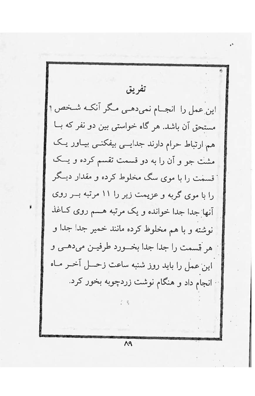 فصل چهارم کتاب به بیان روشهای ایجاد جدایی و دور کردن افراد از یکدیگر اختصاص یافته است. در این فصل، ادعیه و طلسمات مختلف برای ایجاد فاصله بین افراد، از بین بردن دوستیها، و همچنین دور کردن دشمنان بیان شده است. مؤلف تأکید میکند که استفاده از این مطالب باید فقط در موارد ضروری و عادلانه باشد.