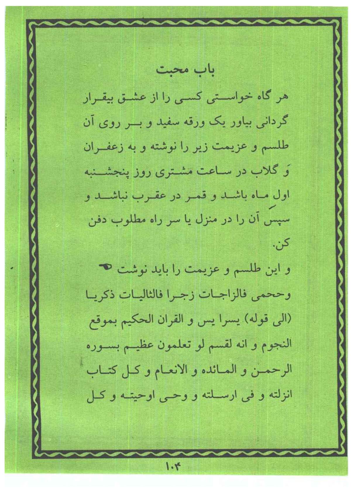 فصل چهارم کتاب به بیان روشهای تسخیر مطلوب و ایجاد مهر و محبت اختصاص یافته است. در این فصل، ادعیه و طلسمات مختلف برای جلب مهر و محبت، تسخیر مطلوب، و همچنین باز کردن مرد بسته بیان شده است. مؤلف در این بخش توضیح میدهد که چگونه میتوان با استفاده از این روشها، بر روابط بین افراد تأثیر مثبت گذاشت و محبت را در دلها جاری ساخت.