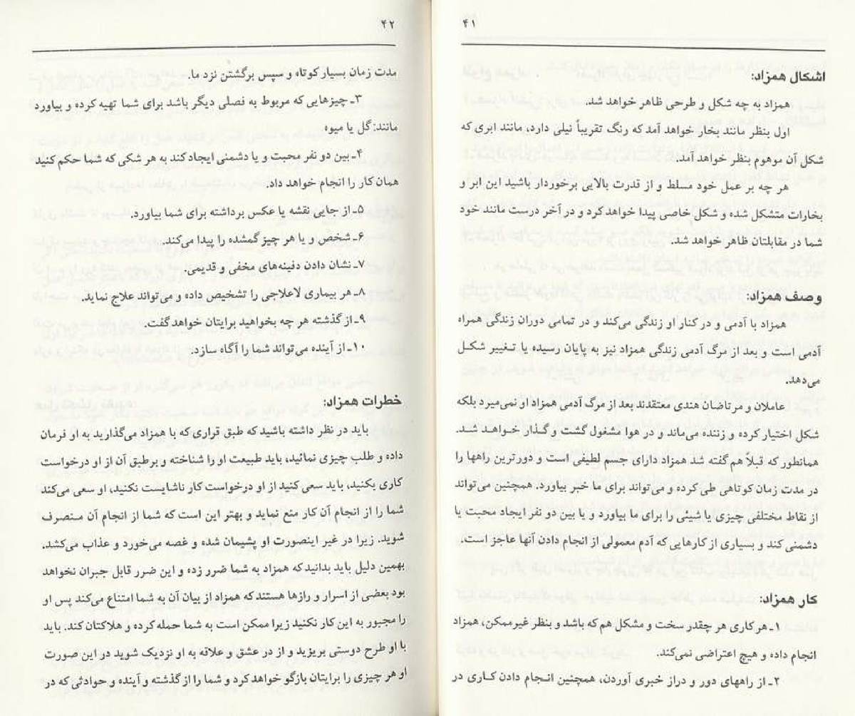 • .حال در این کتاب به مسائل مربوط به همزاد و احضار آن می پردازد و حکایات و دعا ها و عمل هایی که به آن مربوط می شود و اینکه چه جور موجودی است و چه اخلاق و چه خصوصیاتی دارد .